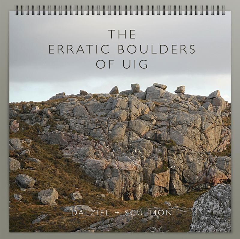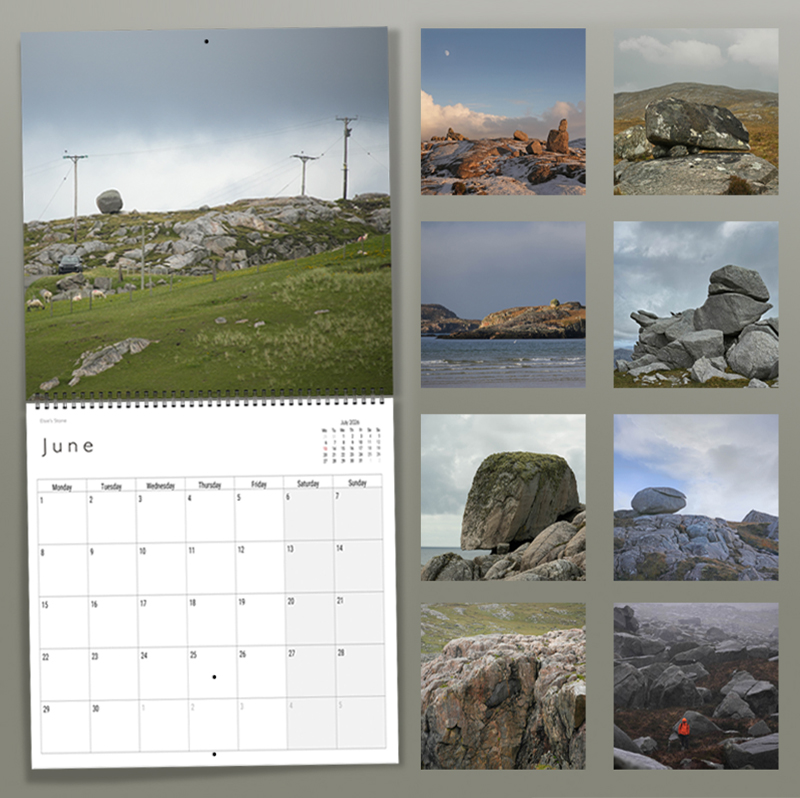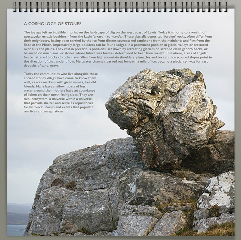 Each year we print a very small run of calendars on a different theme that reflects our island setting. This year we have turned our attention to the spectacular erratic boulders of Uig, glacially deposited ‘foreign’ rocks that often differ from their neighbours, having been carried by the ice from distant sources, to rest in precarious positions. Set down by retreating glaciers on scraped clean gabbro backs, these characterful ollag’s can be seen balanced on much smaller stones whose future will be forever determined to bear their weight.