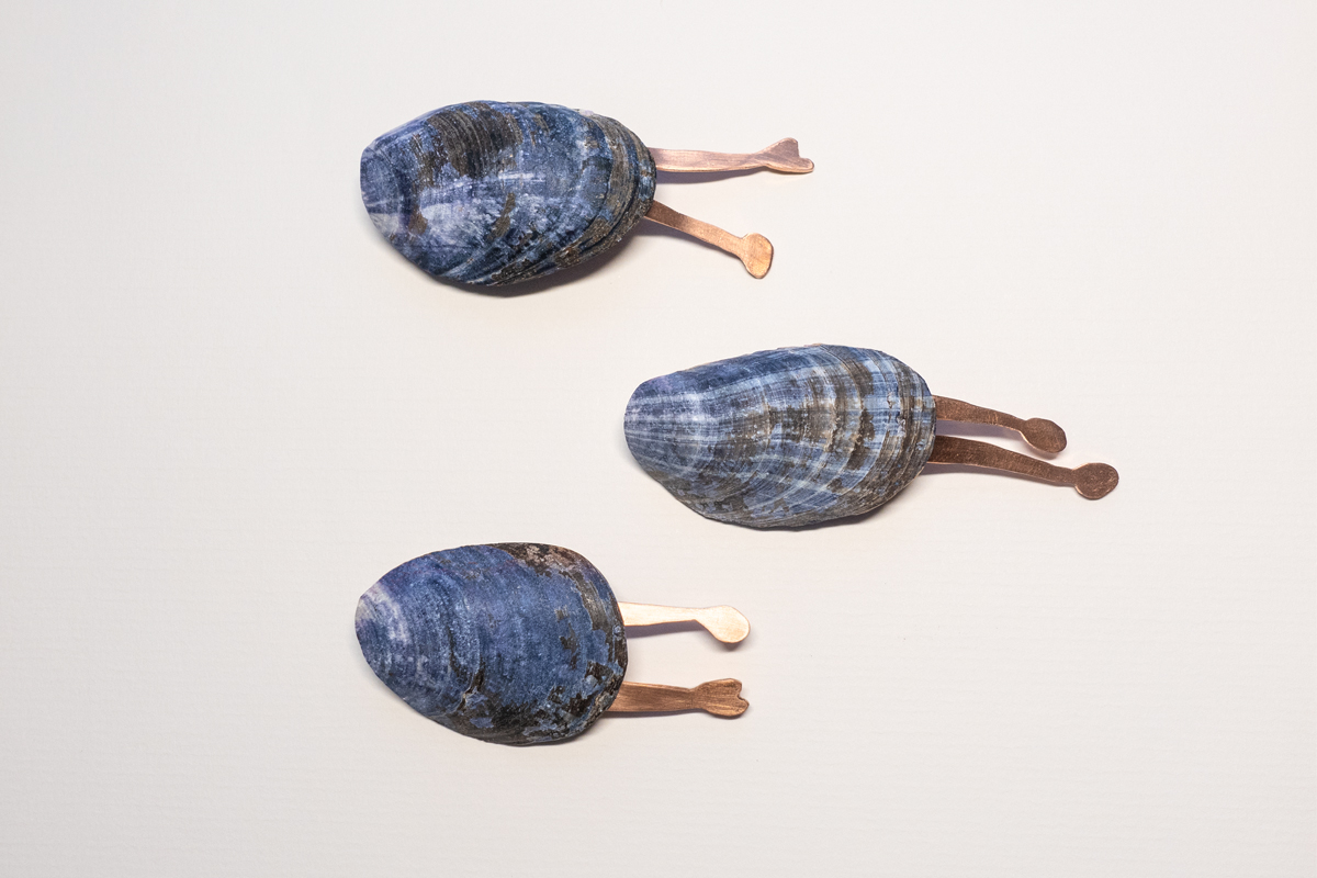 Collectively mussels are said to be eco system engineers, in that they create reefs and stabilise erratic surfaces. As filter feeders, 25 litres of seawater pass through each individual mussel every day and so they play a vital role in estuaries by removing bacteria and toxins. They are both very effected by, and reflective of their environment. These brooches combine a circle of blue mussel shell paired with stylised depictions of their byssal threads.