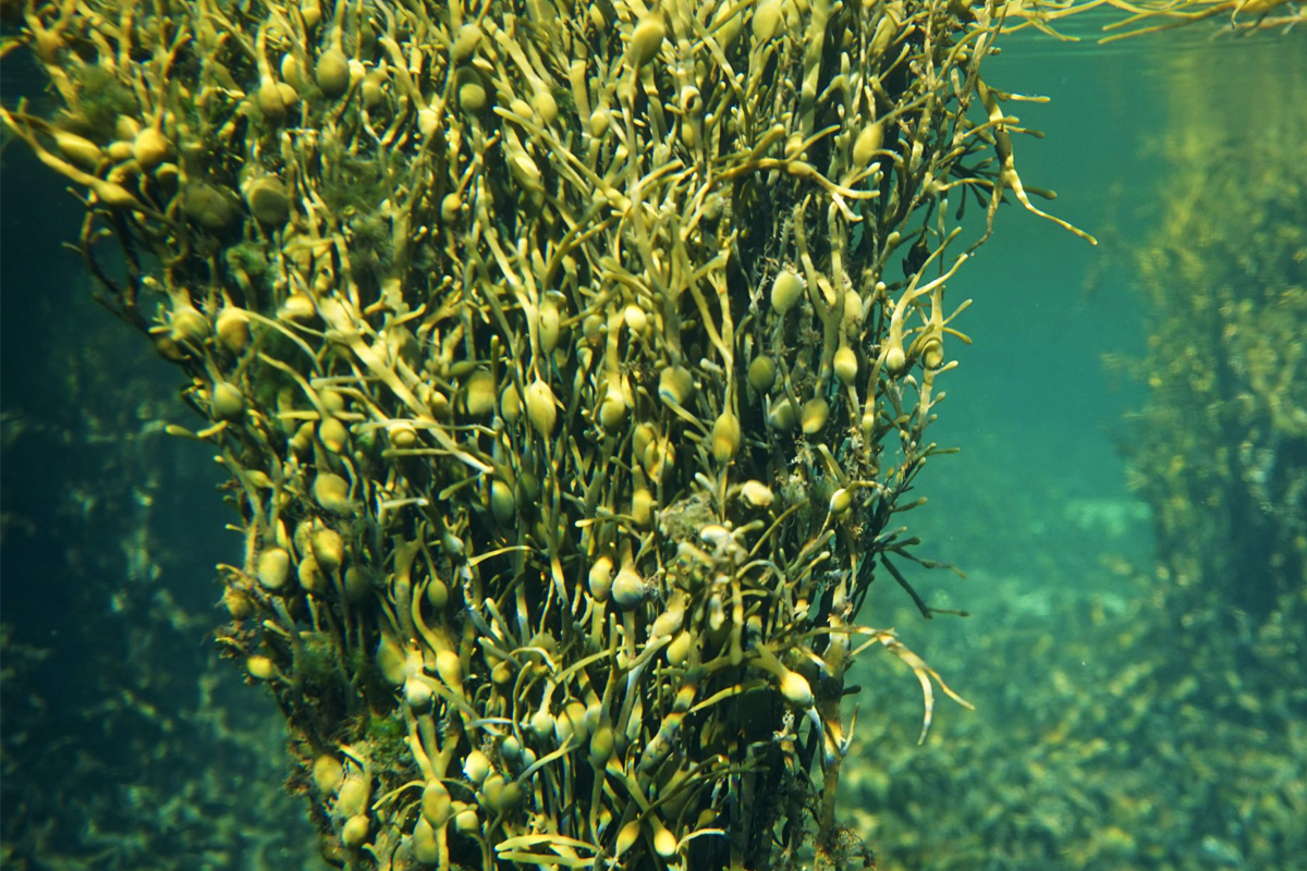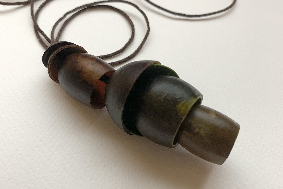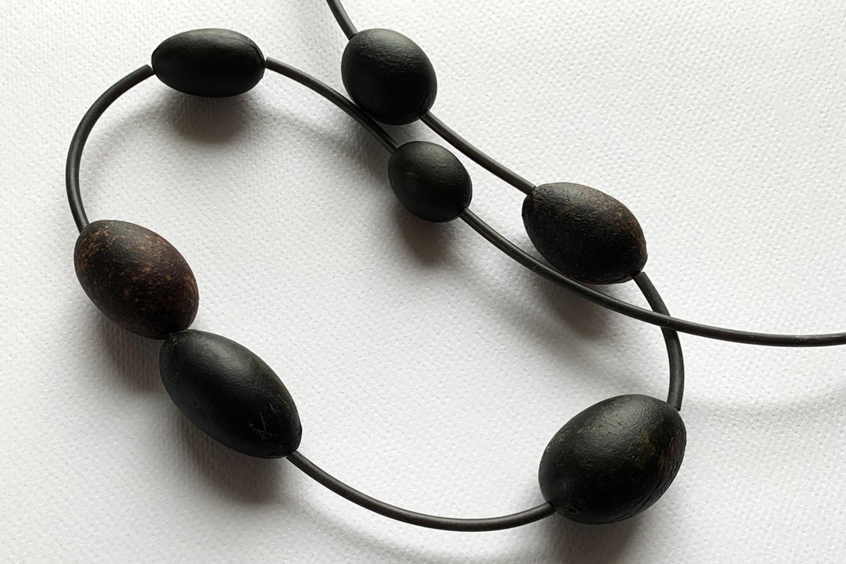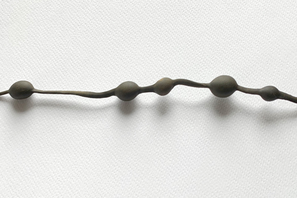 This necklace is made from Knotweed Wrack, a species of seaweed that as it grows, it fabricates bladders that fill with CO2, these float and keep the plant upright, increasing its surface area and ability to absorb carbon more efficiently from the surrounding seawater. Over time seaweeds convert this carbon to organic compounds and biomass. Seaweeds can absorb twenty times more carbon than an equivalent area of trees. Worn over the heart this necklace serves as a reminder of the oxygen debt we owe to the vast plant lungs of the earth.